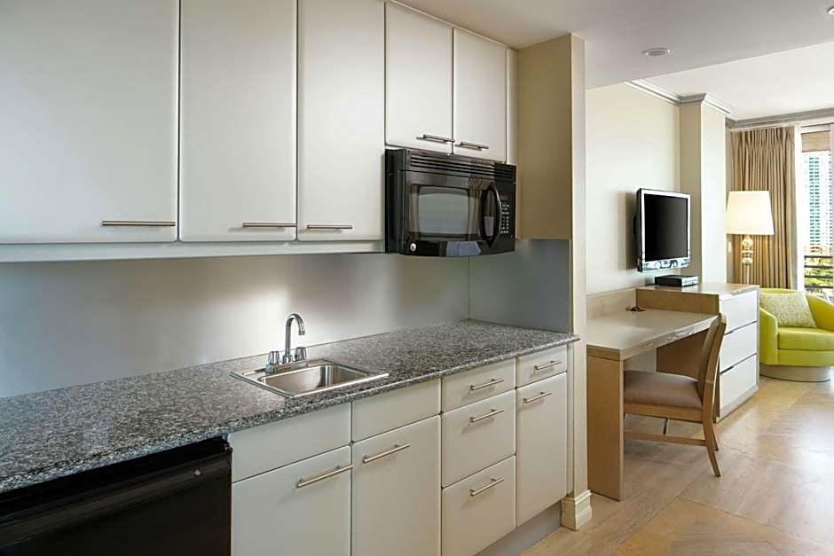 This studio features a microwave, refrigerator and cable TV. City views are available.